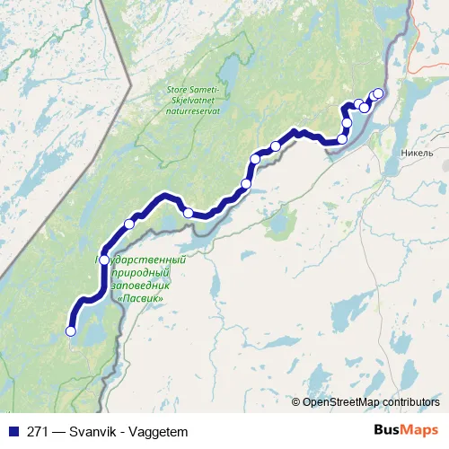 The first stop of the 271 bus route is Vaggetem and the last stop is Pasvik skole / Pasvik folkehøyskole. 271 (Svanvik - Vaggetem) is operational during on weekdays.