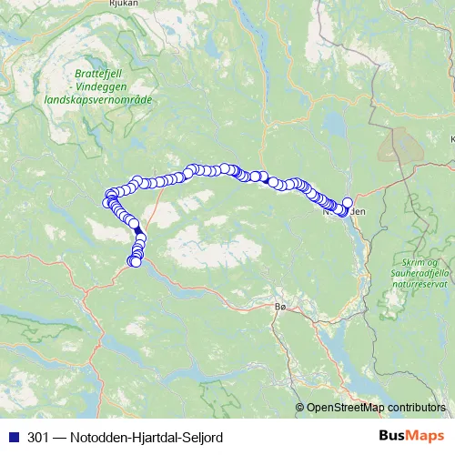 The first stop of the 301 bus route is Notodden skysstasjon and the last stop is Seljord skysstasjon. 301 (Notodden-Hjartdal-Seljord) is operational during on weekdays.