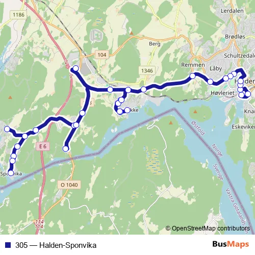The first stop of the 305 bus route is Halden bussterminal and the last stop is Sponvika. 305 (Halden-Sponvika) is operational during on weekdays.