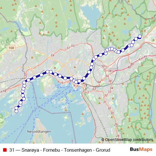 The first stop of the 31 bus route is Snarøya and the last stop is Grorud T. 31 (Snarøya - Fornebu - Tonsenhagen - Grorud) is operational during everyday.