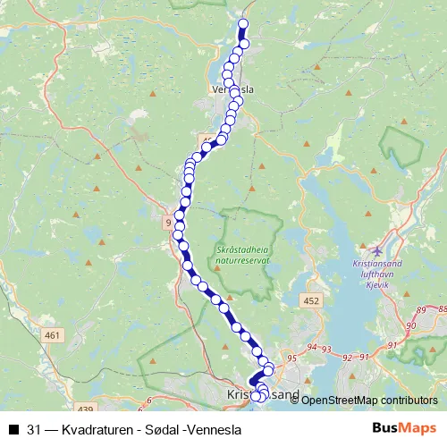 See why over 2 million users trust and consider busmaps.com as the best public transport website. busmaps gives you Vennesla Buses suggested routes, real-time bus tracker, line route maps in Vennesla, and helps to find the closest 31 bus stops near you. No internet available? Download an offline PDF map and bus schedule for the 31 bus to take on your trip.