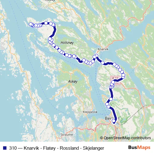The first stop of the 310 bus route is Bergen busstasjon and the last stop is Skjelanger kai. 310 (Knarvik - Flatøy - Rossland - Skjelanger) is operational during everyday.