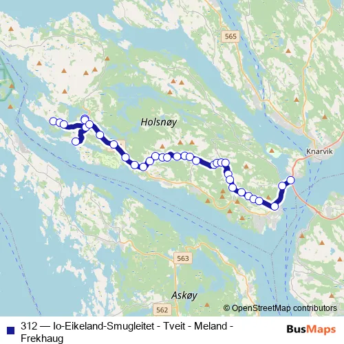 The first stop of the 312 bus route is Io snuplass and the last stop is Flatøy terminal. 312 (Io-Eikeland-Smugleitet - Tveit - Meland - Frekhaug) is operational during everyday.
