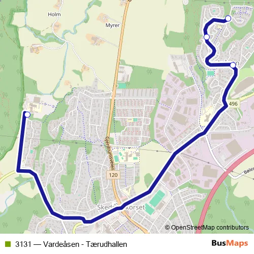 The first stop of the 3131 bus route is Tærudhallen and the last stop is Vardeåsen. 3131 (Vardeåsen - Tærudhallen) is operational during on weekdays.