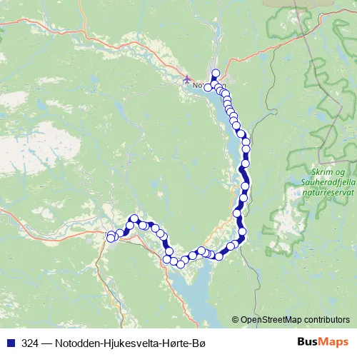 The first stop of the 324 bus route is Notodden skysstasjon and the last stop is Bø stasjon. 324 (Notodden-Hjukesvelta-Hørte-Bø) is operational during on weekdays.
