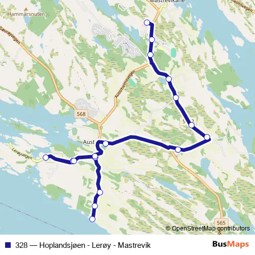 The first stop of the 328 bus route is Hoplandsjøen kai and the last stop is Mastrevik torg. 328 (Hoplandsjøen - Lerøy - Mastrevik) is operational during on weekdays.