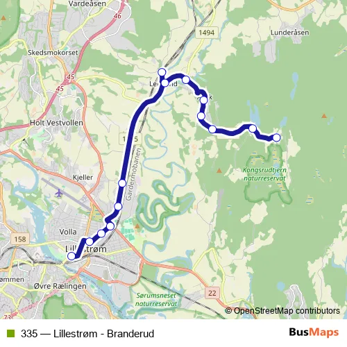 The first stop of the 335 bus route is Lillestrøm bussterminal and the last stop is Branderud. 335 (Lillestrøm - Branderud) is operational during on weekdays.