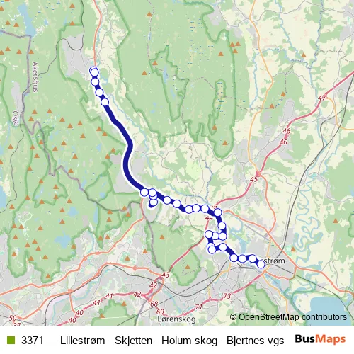 The first stop of the 3371 bus route is Bjertnes vgs. and the last stop is Lillestrøm bussterminal. 3371 (Lillestrøm - Skjetten - Holum skog - Bjertnes vgs) is operational during on weekdays.