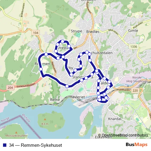 The first stop of the 34 bus route is Halden bussterminal and the last stop is Halden bussterminal. 34 (Remmen-Sykehuset) is operational during everyday.
