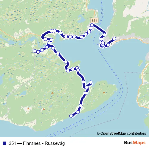 The first stop of the 351 bus route is Tortenlia kryss and the last stop is Russevåg Sandneset. 351 (Finnsnes - Russevåg) is operational during on weekdays.