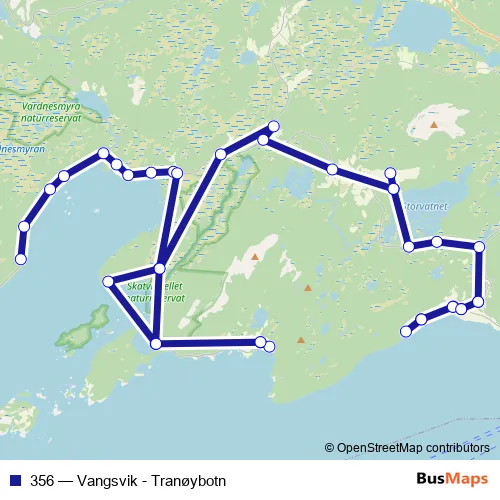 The first stop of the 356 bus route is Lyngmoen and the last stop is Vikstranda skole. 356 (Vangsvik - Tranøybotn) is operational during on weekdays.