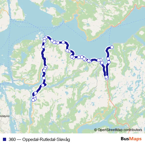The first stop of the 360 bus route is Oppedal ferjekai and the last stop is Dalsøyra. 360 (Oppedal-Rutledal-Sløvåg) is operational during everyday.