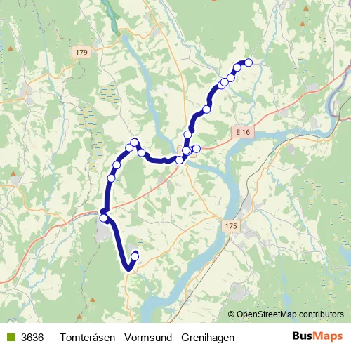 The first stop of the 3636 bus route is Neskollen and the last stop is Grenihagen. 3636 (Tomteråsen - Vormsund - Grenihagen) is operational during on weekdays.