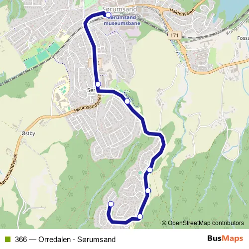 The first stop of the 366 bus route is Orredalen and the last stop is Sørumsand stasjon. 366 (Orredalen - Sørumsand) is operational during everyday.