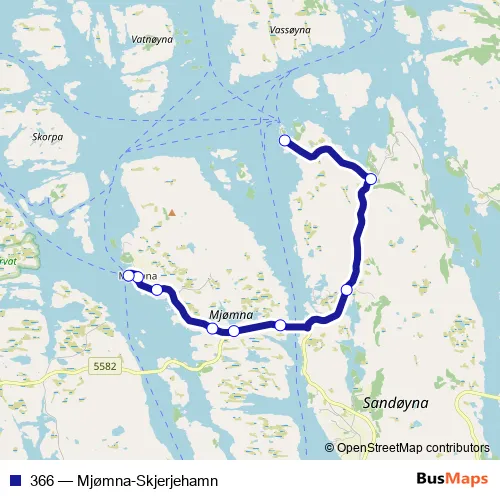The first stop of the 366 bus route is Skjerjehamn and the last stop is Mjømna kai. 366 (Mjømna-Skjerjehamn) is operational during everyday.