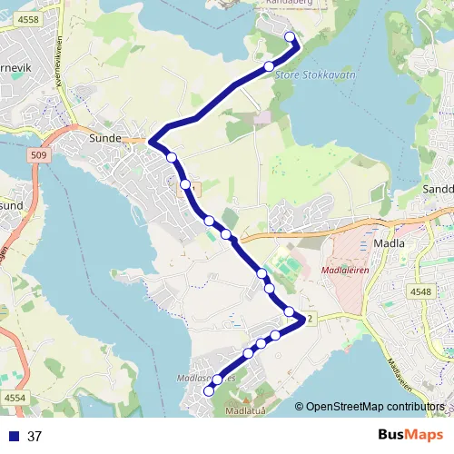 The first stop of the 37 bus route is Friheim and the last stop is Madlasandnes. 37 is operational during on weekdays.