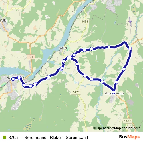 The first stop of the 370a bus route is Sørumsand stasjon and the last stop is Sørumsand stasjon. 370a (Sørumsand - Blaker - Sørumsand) is operational during everyday.