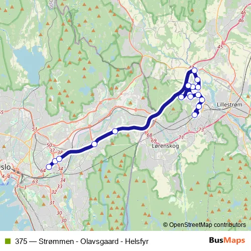 The first stop of the 375 bus route is Helsfyr T and the last stop is Strømmen stasjon. 375 (Strømmen - Olavsgaard - Helsfyr) is operational during on weekdays.
