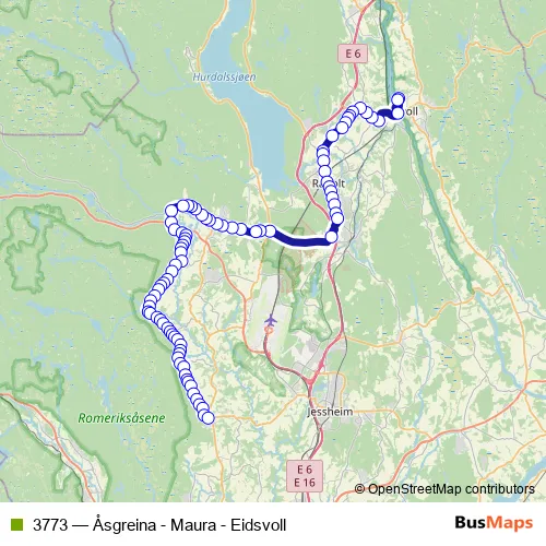 The first stop of the 3773 bus route is Eidsvoll vgs. and the last stop is Eltonåsen. 3773 (Åsgreina - Maura - Eidsvoll) is operational during on weekdays.