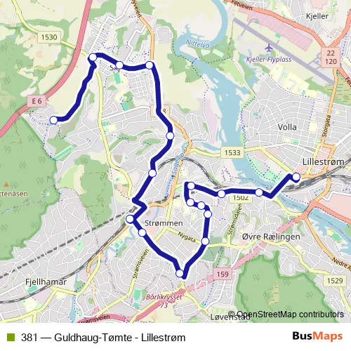 The first stop of the 381 bus route is Guldhaug-Tømte and the last stop is Lillestrøm bussterminal. 381 (Guldhaug-Tømte - Lillestrøm) is operational during everyday.