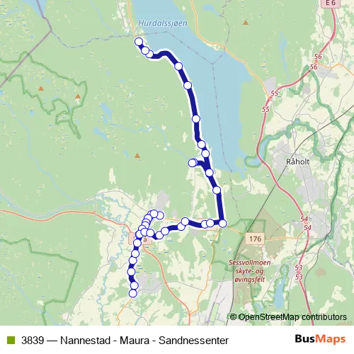 The first stop of the 3839 bus route is Maura skoleplass and the last stop is Sandsnesseter. 3839 (Nannestad - Maura - Sandnessenter) is operational during on weekdays.