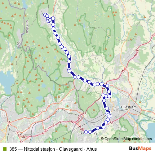 The first stop of the 385 bus route is Nittedal stasjon and the last stop is Lørenskog sentrum. 385 (Nittedal stasjon - Olavsgaard - Ahus) is operational during everyday.