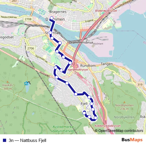 The first stop of the 3n bus route is Bragernes torg and the last stop is Fjell. 3n (Nattbuss Fjell) is operational during on weekends.