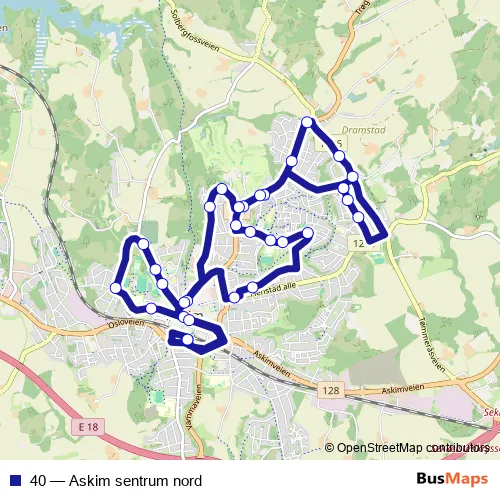 The first stop of the 40 bus route is Askim stasjon and the last stop is Askim stasjon. 40 (Askim sentrum nord) is operational during on weekdays.