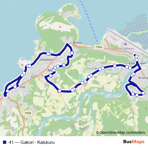 The first stop of the 41 bus route is Alta sentrum and the last stop is Alta sentrum. 41 (Gakori - Kaiskuru) is operational during everyday.