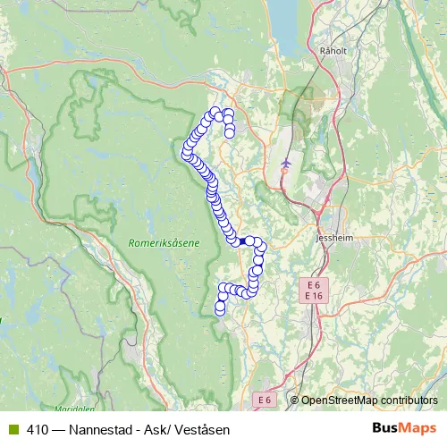 The first stop of the 410 bus route is Veståsen skole and the last stop is Nannestad torg. 410 (Nannestad - Ask/ Veståsen) is operational during everyday.