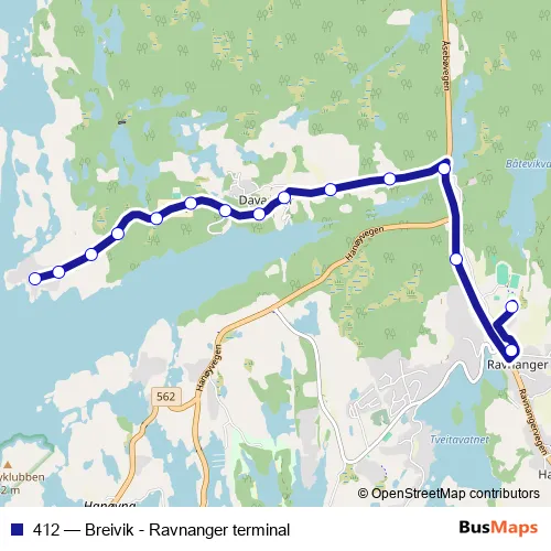 The first stop of the 412 bus route is Breivik snuplass and the last stop is Ravnanger ungdomsskole. 412 (Breivik - Ravnanger terminal) is operational during on weekdays.
