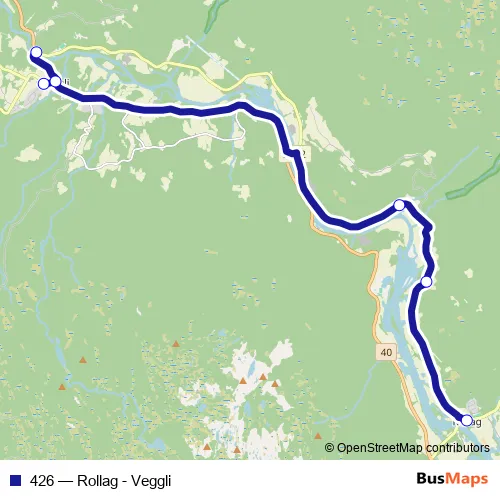 The first stop of the 426 bus route is Veggli skole and the last stop is Rollag sentrum. 426 (Rollag - Veggli) is operational during on weekdays.
