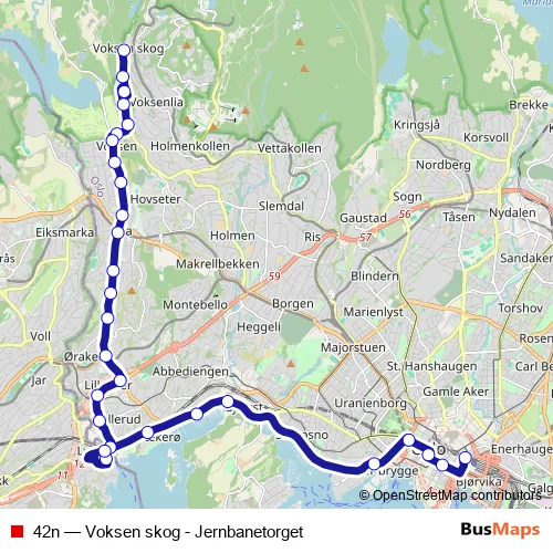 The first stop of the 42n bus route is Voksen skog and the last stop is Jernbanetorget. 42n (Voksen skog - Jernbanetorget) is operational during on weekends.