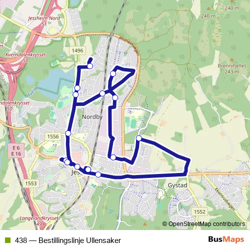The first stop of the 438 bus route is Jessheim stasjon and the last stop is Jessheim stasjon. 438 (Bestillingslinje Ullensaker) is operational during everyday.