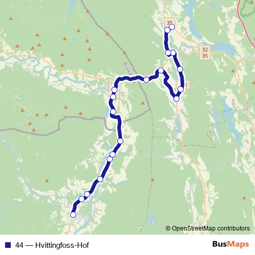 The first stop of the 44 bus route is Svarstad bussgarasjen and the last stop is Hof. 44 (Hvittingfoss-Hof) is operational during on weekdays.