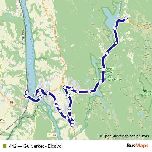 The first stop of the 442 bus route is Finsbråten and the last stop is Eidsvoll stasjon. 442 (Gullverket - Eidsvoll) is operational during on weekdays.
