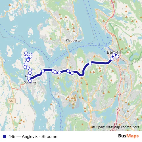 The first stop of the 445 bus route is Våge snuplass and the last stop is Bergen busstasjon. 445 (Anglevik - Straume) is operational during everyday.