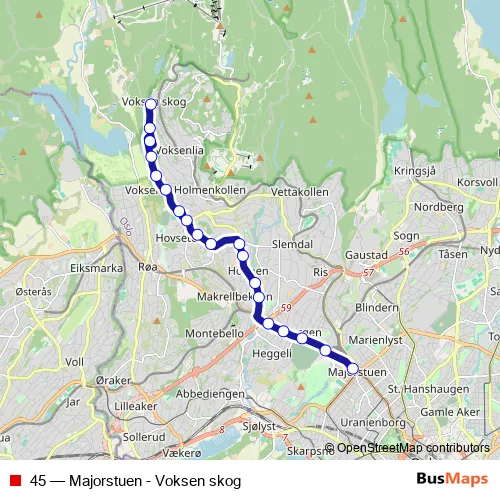 The first stop of the 45 bus route is Majorstuen and the last stop is Voksen skog. 45 (Majorstuen - Voksen skog) is operational during everyday.