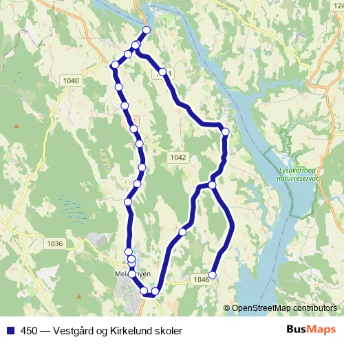 The first stop of the 450 bus route is Vestgård skole and the last stop is Vestgård skole. 450 (Vestgård og Kirkelund skoler) is operational during on weekdays.