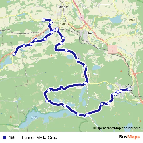 The first stop of the 466 bus route is Lunner barneskole and the last stop is Grua skole. 466 (Lunner-Mylla-Grua) is operational during on weekdays.