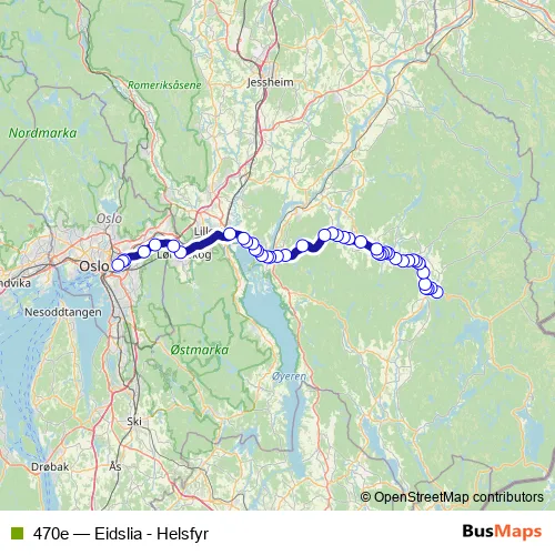 The first stop of the 470e bus route is Eidslia and the last stop is Helsfyr T. 470e (Eidslia - Helsfyr) is operational during on weekdays.