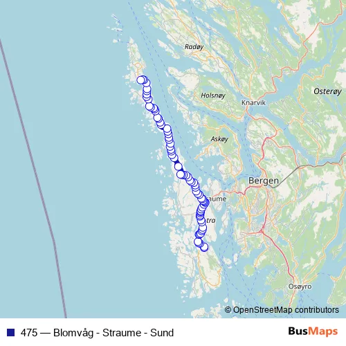 The first stop of the 475 bus route is Sotra vgs. and the last stop is Tjeldstø terminal. 475 (Blomvåg - Straume - Sund) is operational during on weekdays.