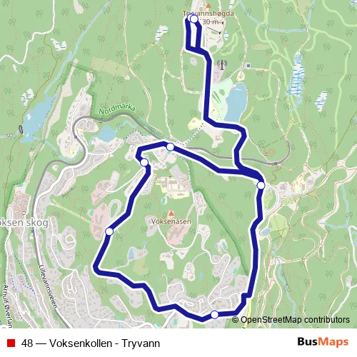 The first stop of the 48 bus route is Tryvann and the last stop is Tryvann. 48 (Voksenkollen - Tryvann) is operational during everyday.