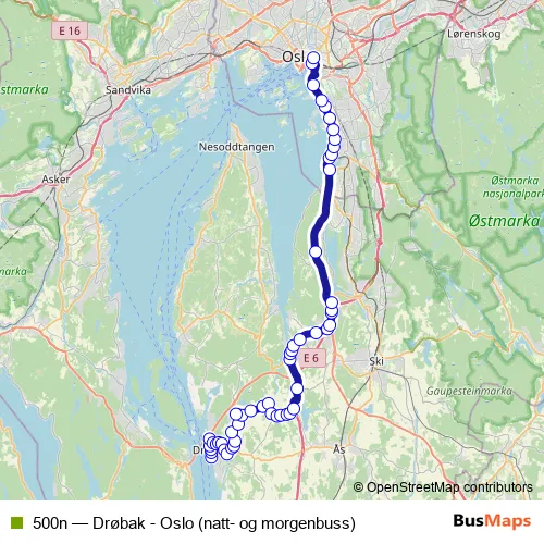 The first stop of the 500n bus route is Drøbak brygge and the last stop is Oslo bussterminal. 500n (Drøbak - Oslo (natt- og morgenbuss)) is operational during everyday.