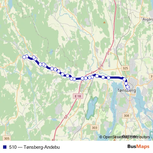 The first stop of the 510 bus route is Tønsberg rutebilstasjon and the last stop is