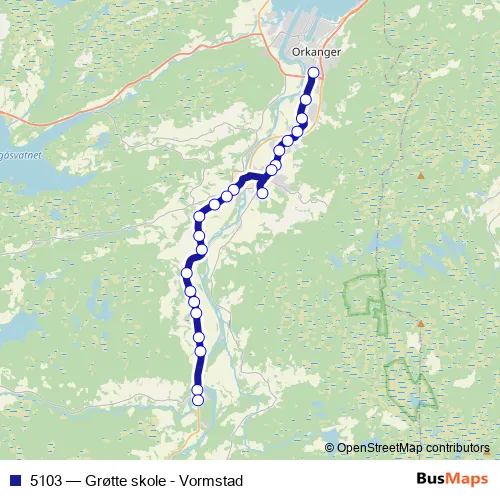 The first stop of the 5103 bus route is Orkanger skysstasjon and the last stop is Best Vormstad. 5103 (Grøtte skole - Vormstad) is operational during on weekdays.