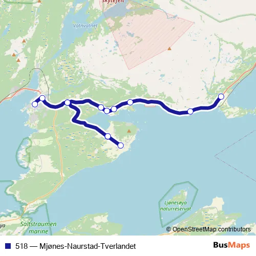 The first stop of the 518 bus route is Nye Tverlandet skole and the last stop is Mjønes. 518 (Mjønes-Naurstad-Tverlandet) is operational during on weekdays.