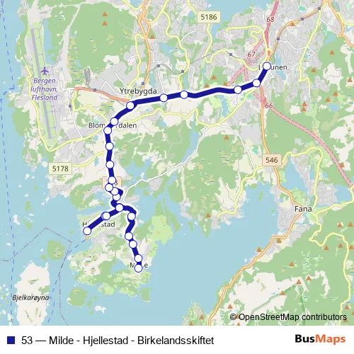The first stop of the 53 bus route is Milde snuplass and the last stop is Lagunen terminal. 53 (Milde - Hjellestad - Birkelandsskiftet) is operational during everyday.