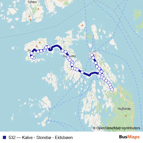 The first stop of the 532 bus route is Kalve snuplass and the last stop is Austevoll us. 532 (Kalve - Storebø - Eidsbøen) is operational during everyday.