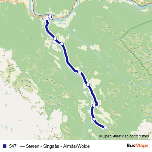 The first stop of the 5471 bus route is Bjørgen and the last stop is Wolden. 5471 (Støren - Singsås - Almås/Wolde) is operational during on weekdays.